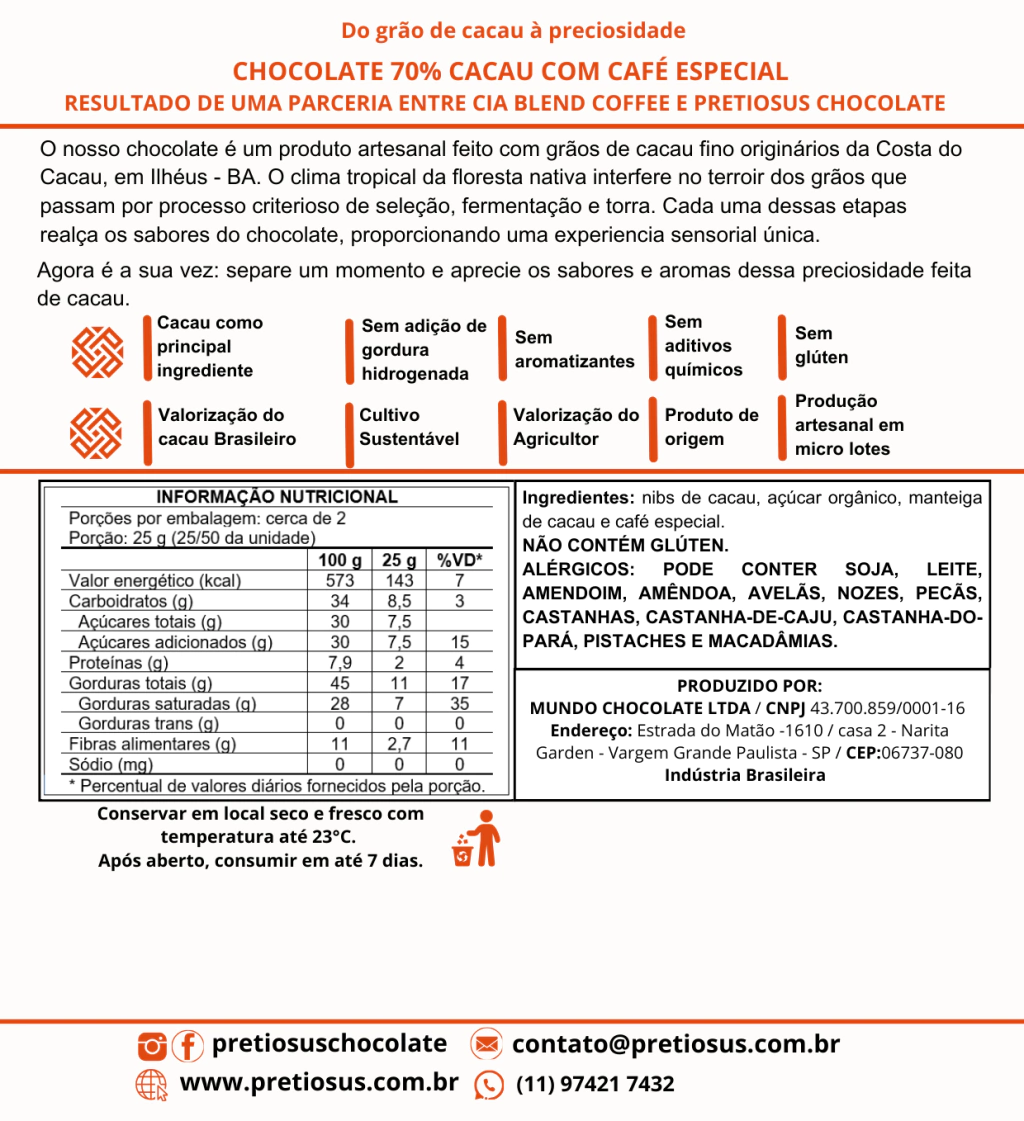 Elaborado artesanalmente com ingredientes nobres — nibs de cacau, açúcar cristal orgânico, manteiga de cacau e café especial — cada barra traz um sabor intenso, rico e equilibrado, capaz de encantar os paladares mais exigentes.